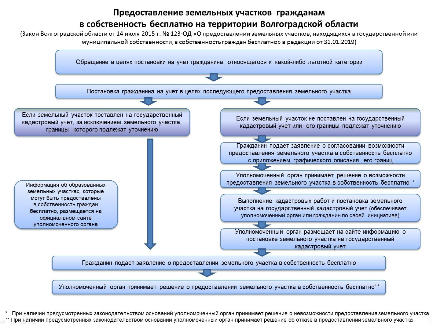 Упрощенная блок-схема последовательности действий с целью получения земельного участка в собственность бесплатно на территории Волгоградской области с 12.02.2019